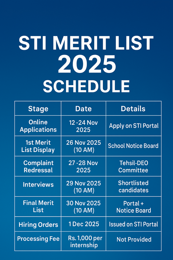 Explore the official STI Merit List 2025 schedule with application dates, merit display, complaint handling, interviews and hiring orders. A powerful, easy-to-understand guide for all applicants.