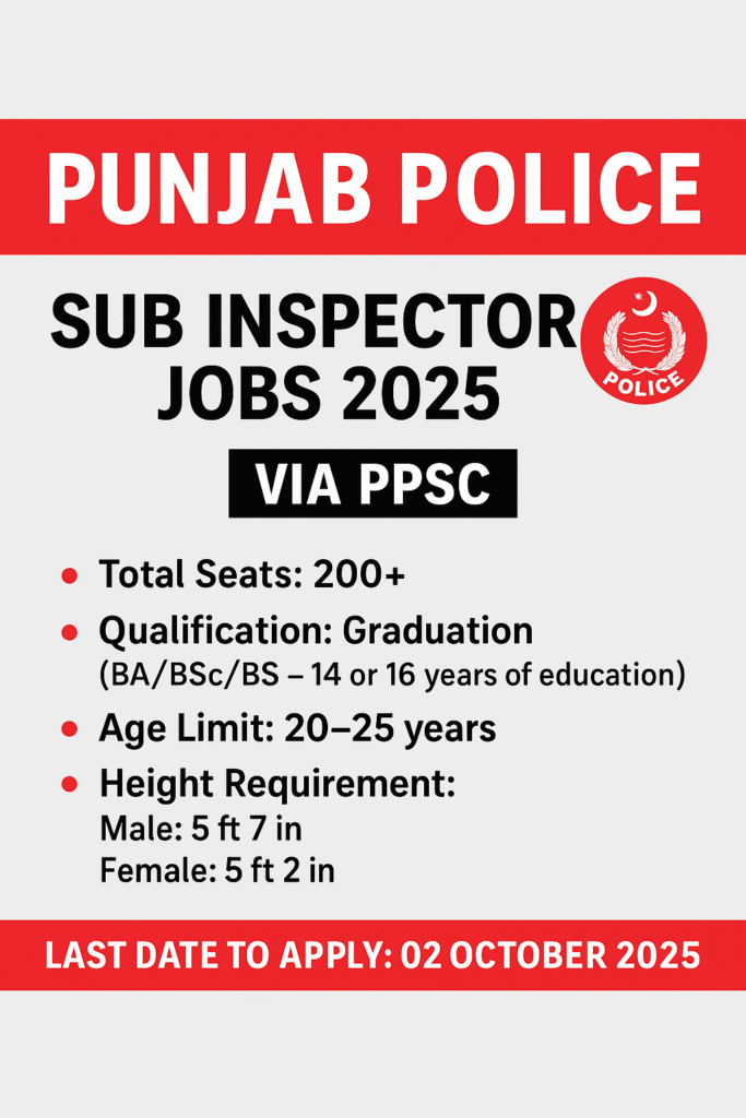 The Punjab Public Service Commission (PPSC) has officially announced recruitment for Sub Inspector (BS-14) in Punjab Police. This is a great opportunity for eligible candidates to serve in the police force. Applications are invited from both male and female candidates before the closing date 02 October 2025.
